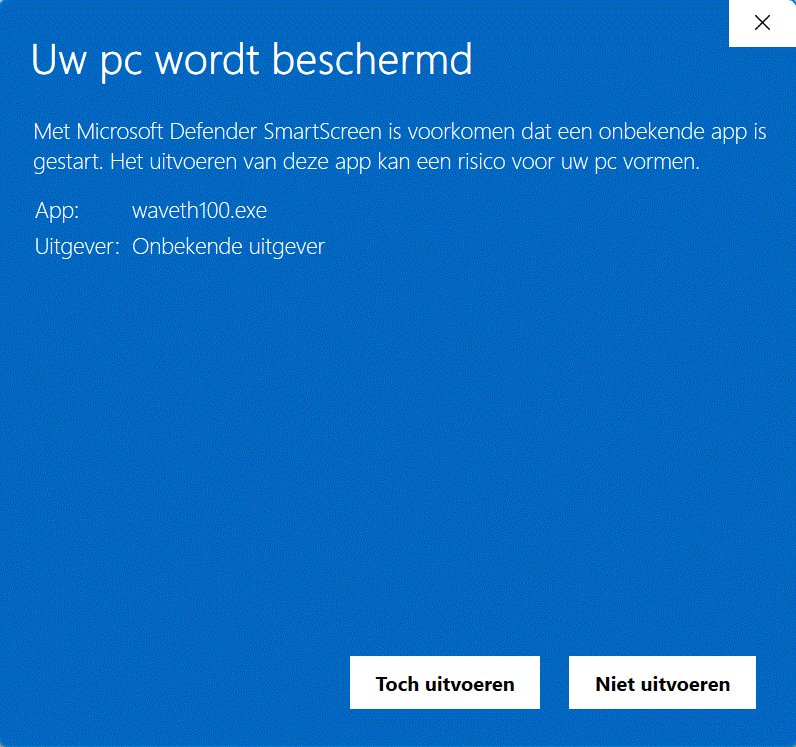 WaveThunder is started up. Next time you startup the WaveThunder using this exe-file, the dialogbox did not show up anymore, because you have signalled Windows that you trust this exe-file.