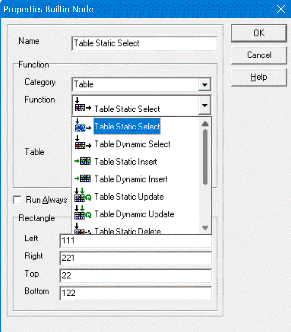 When adding a Static Table Node to the Factory, you must specify an existing Table. When the Node is created, you can easily refer to Columns, because the Table is already specified. There are 4 kinds of Static Table Nodes: Select, Insert, Update and Delete.