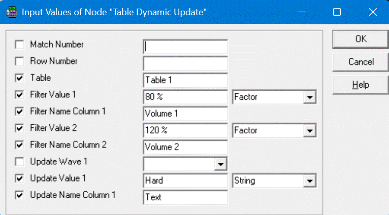 When adding a Dynamic Table Node to the Factory, you do not specify a Table. The Node has a Mandatory Input for the Name of the Table. For each Column you will use, it has an Input for the Name of the Column, beside the Value for the Column. There are 4 kinds of Dynamic Table Nodes: Select, Insert, Update and Delete.