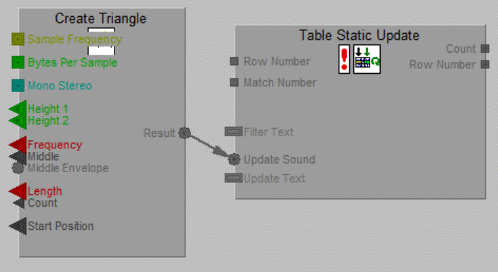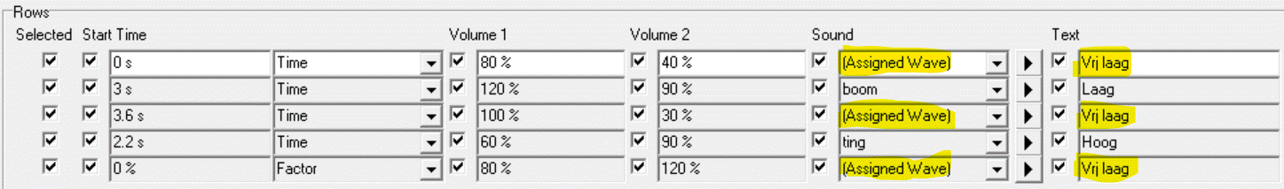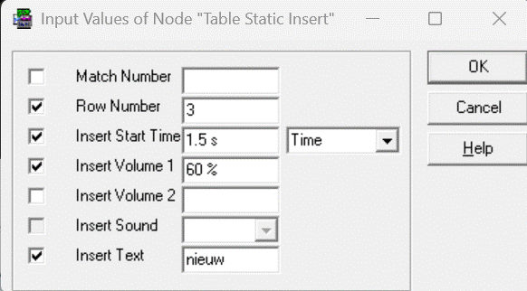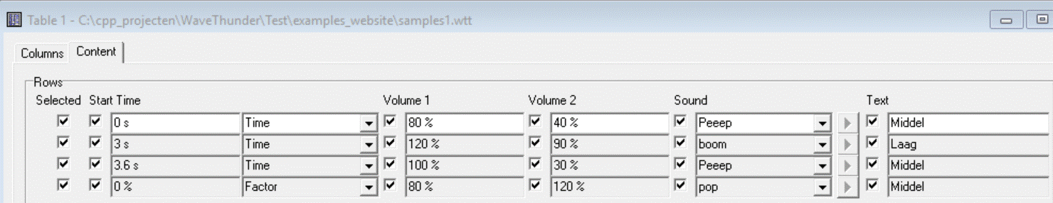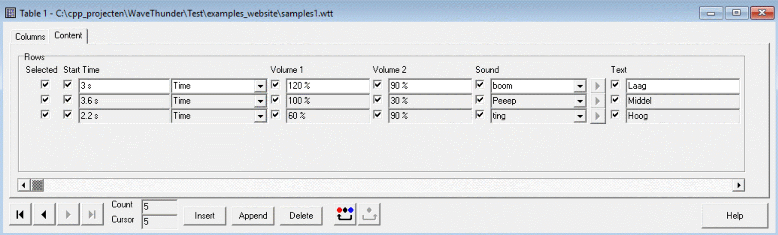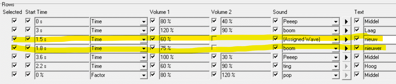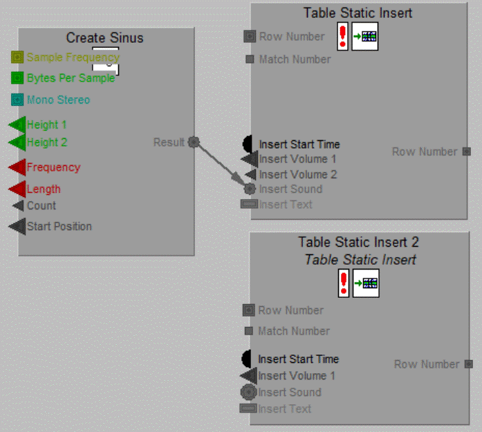 The third row is added by the first Insert Node, you see that in Column Sound you see the text "(Assigned Wave)", this means the Wave is stored into the Table instead of refered to a Wave Window.