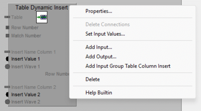 Fill Input Insert Name Column n with the name of the Column to fill. If the Column is of a Wave-type you give the Input Insert Wave n the Value of the Wave, of else the Input Insert Value n.