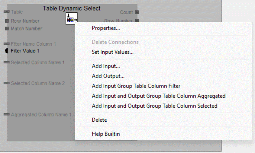 When you add an Output Group for the selected value of the Column or the Aggregated value for one of more selected Rows, then also an Input Selected/Aggregated Column Name n is added to fill in the name of the Column. For selected value both Output Selected Column Value n as are added. For aggregated values the group of 4 Outputs are added.