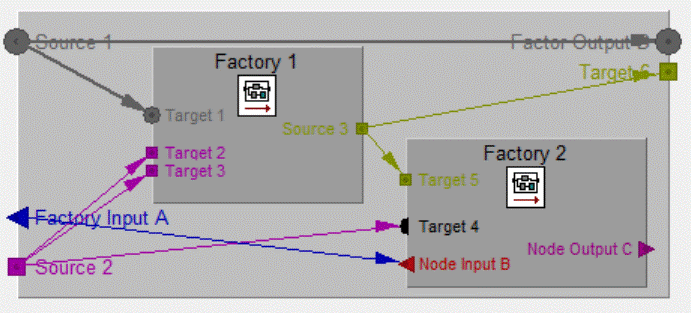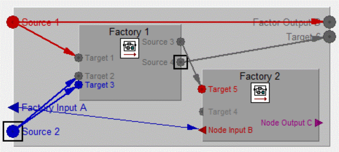 A Source is always an Input of a Factory of an Output of a Node.