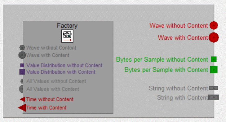 A Factory Node is always connected to a Factory. This Factory must be loaded in the WaveThunder. Dependent of the kind of the Factory Node the Factory is used some way to do the work. In some cases the Factory is used (runned) multiple times, or sometimes not used.