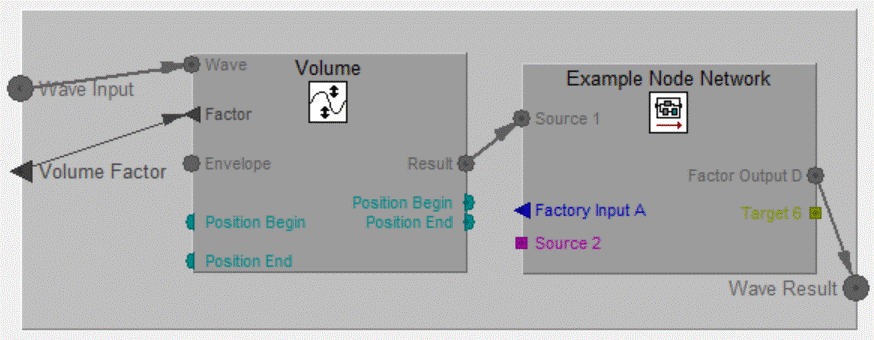 The following Factory has two nodes. De Node "Volume" is a Builtin Node to change the volume of the incoming Wave. The second Node refer to a Factory with name "Example Node Network" which must be loaded in the WaveThunder: