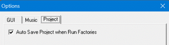 You can specify whether or not save a Project automatically before run one or more Factories. You can do this in the Options of the WaveThunder, you found the right settings under tab "Project":
