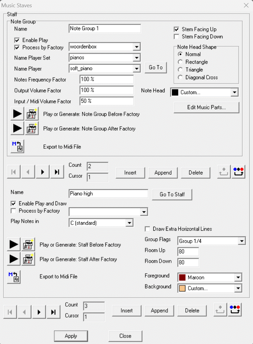 All settings for the current selected Note Group are in group Note Group. For example the Note group uses Player "soft_piano" in the Player Set "pianos". The Staff has two Note Groups, the first Note Group is selected here.