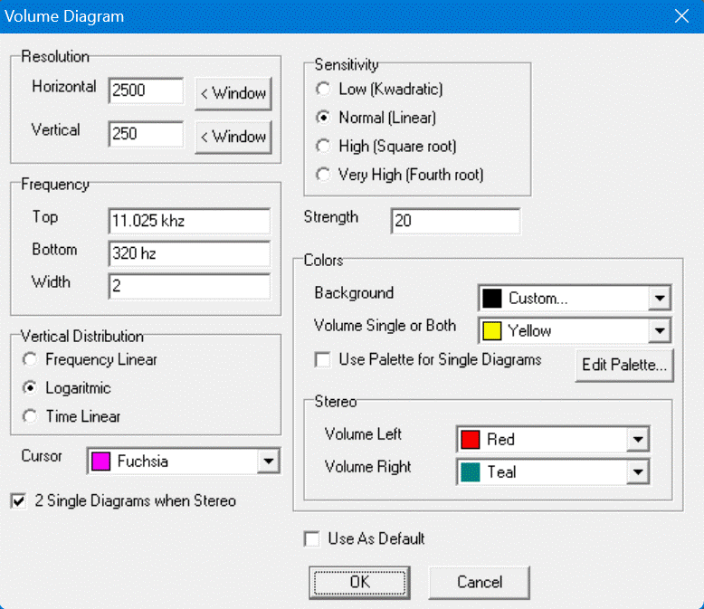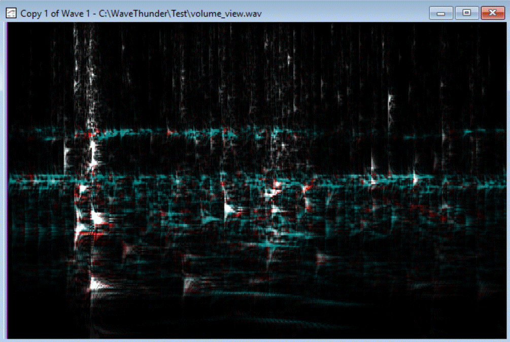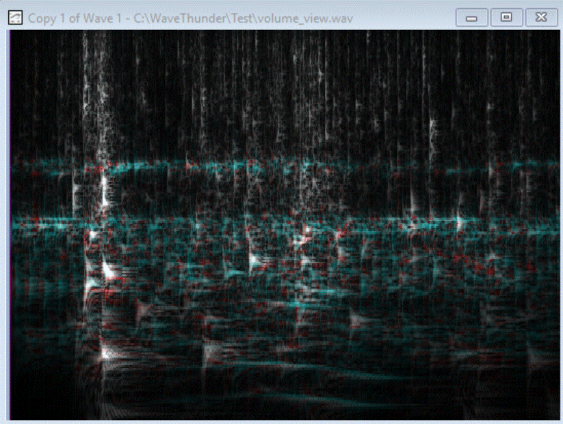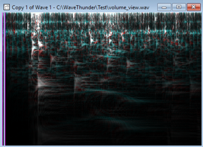 Here the two waves are drawed together. For the left channel color red is used: Volume Left under Stereo under Colors. For the right channel color teal is used: Volume Right. For high volumes at both channels at the same time color yellow is used: Volume Single or Both.
