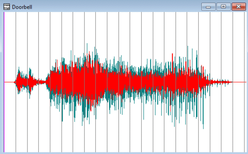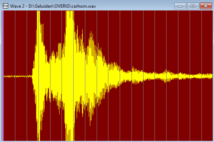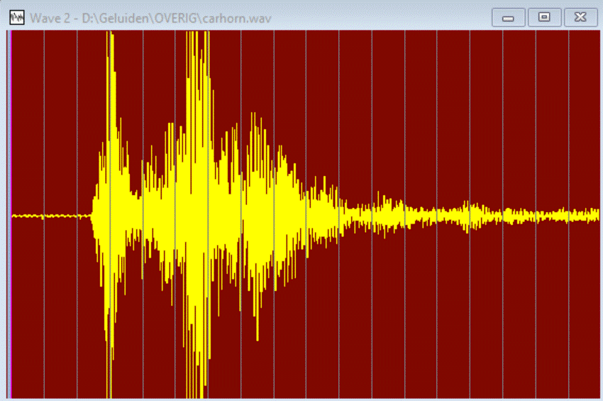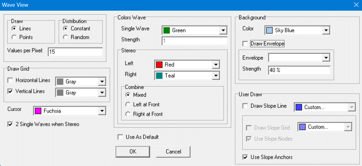 In the left View, the Wave of the left channel (red) is drawed at the front by choosing option Left at Front (under Stereo under Colors Wave), option Lines is also choosen. In the right View the Wave of the right channel is drawed at the front by choosing option Right at Front, option Points is also choosen, and a high value at Values per Pixel.
